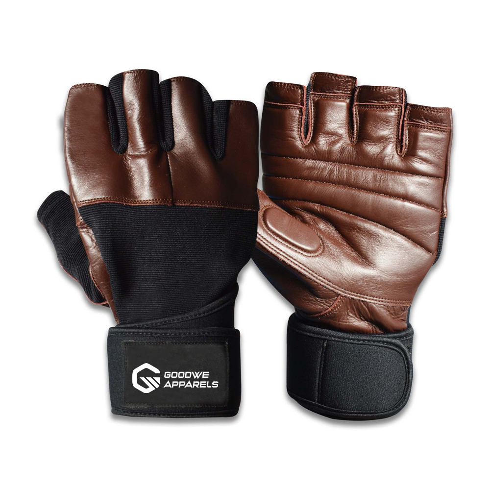Gym Glove. Made of Cow hide leather on palm with Cow hide leather reinforcement. Gel Padding on Palm. Back side Cow hide leather and Fourway. Elasticated Wrist with Long Neoprene Strap with Hook & Loop Closure.