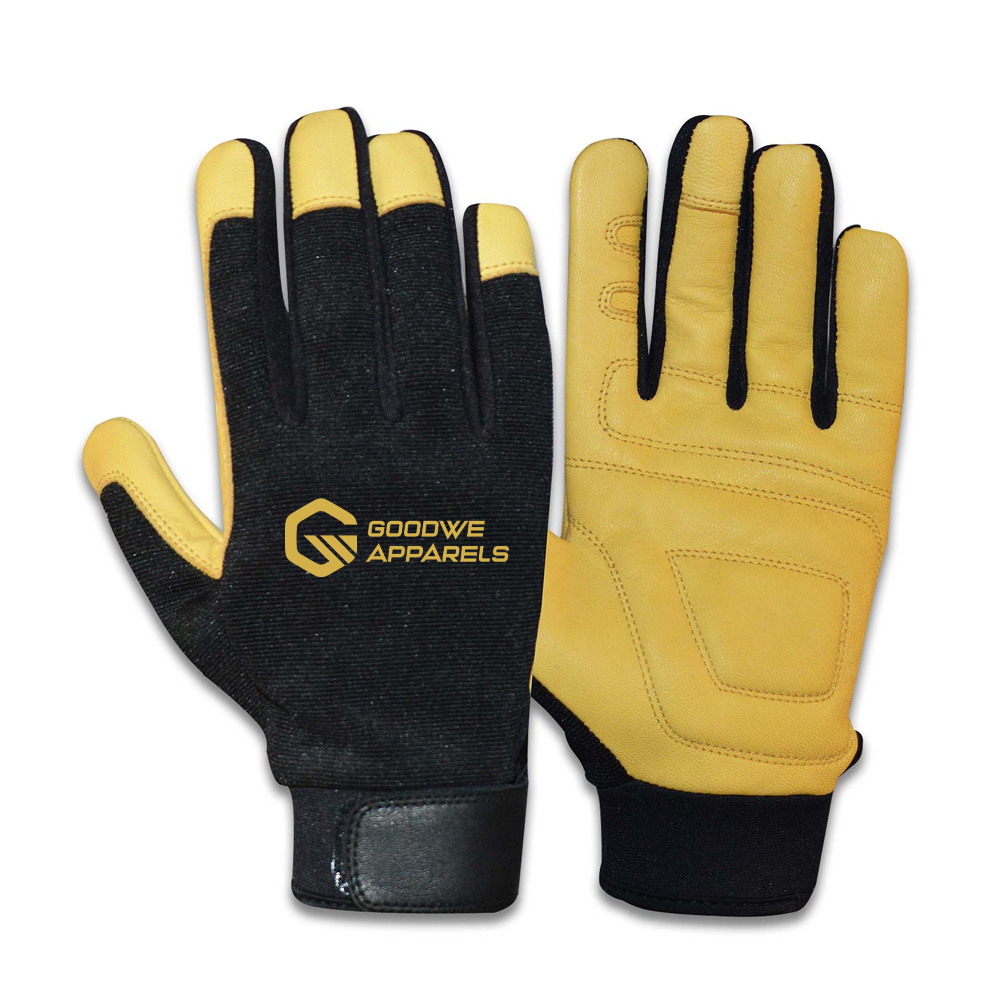 Mechanic Glove. Palm side Goatskin Leather (Yellow) and Back side Fourway. Inside Foam padding on Palm. Playboy with foam lamination. Neoprene on Wrist. Hook and Loop Closure.